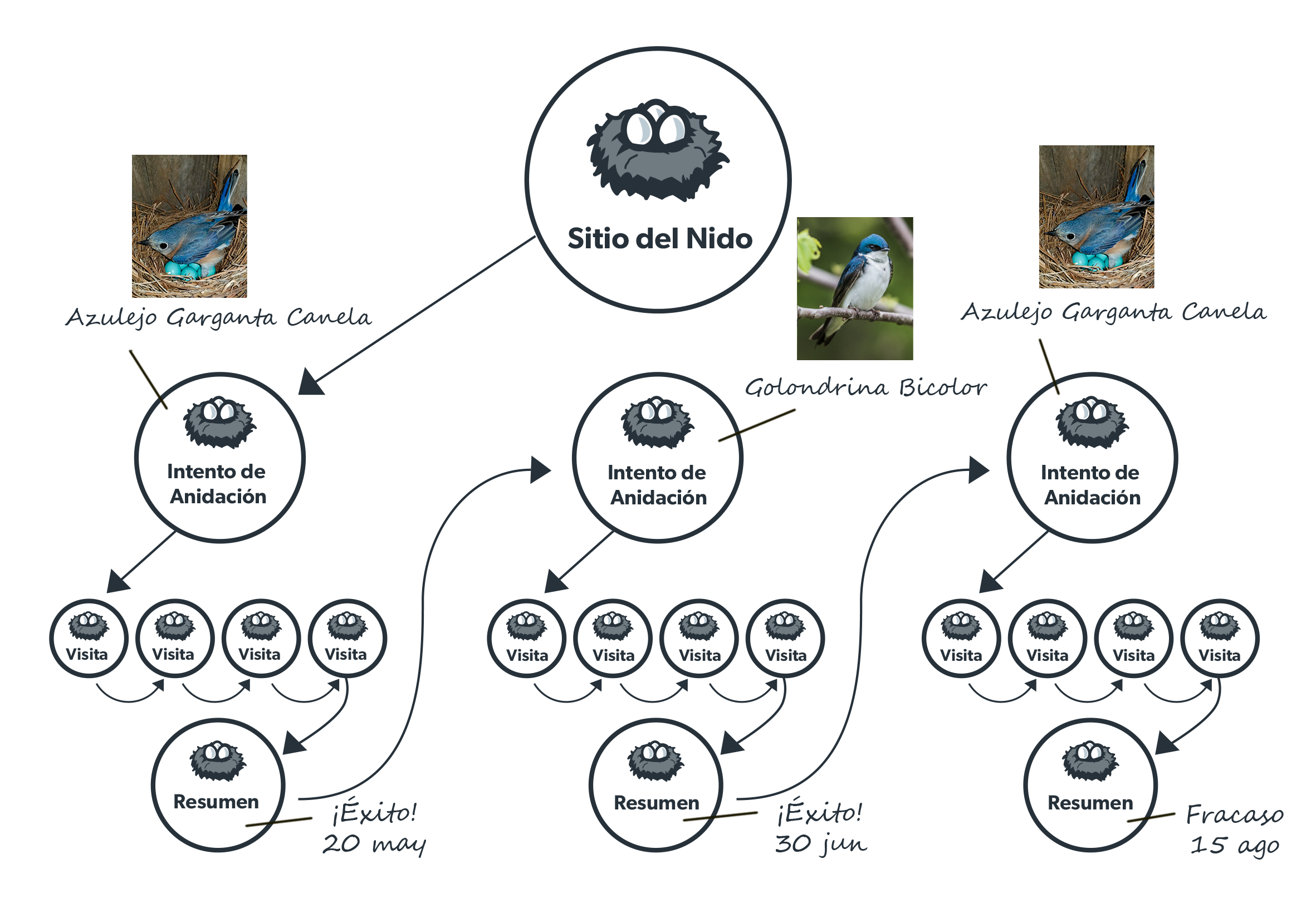 Datos recopilados en esta etapa: Fecha de la primera puesta, fecha de salida del cascarón y fecha de la primera salida del nido, y, si realmente observaste estos sucesos o si estás estimando; Totales de la especie; Resultado final del nido.